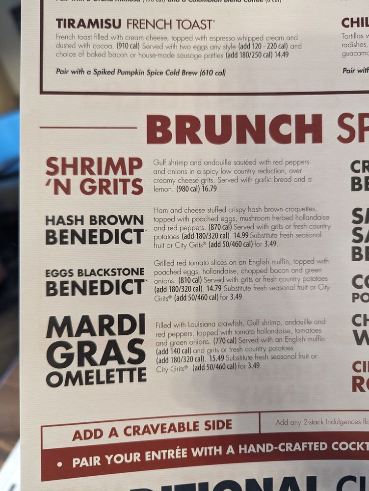 Blackberry cream cheese stuffed French toast with mango whipped cream & rum butter sauce drizzle (1010 cal). With two eggs any style (+120-220 cal) & bacon or sausage patties (+180/320 cal)